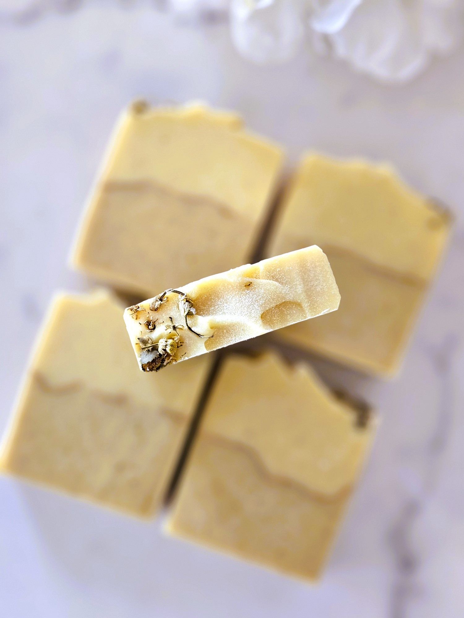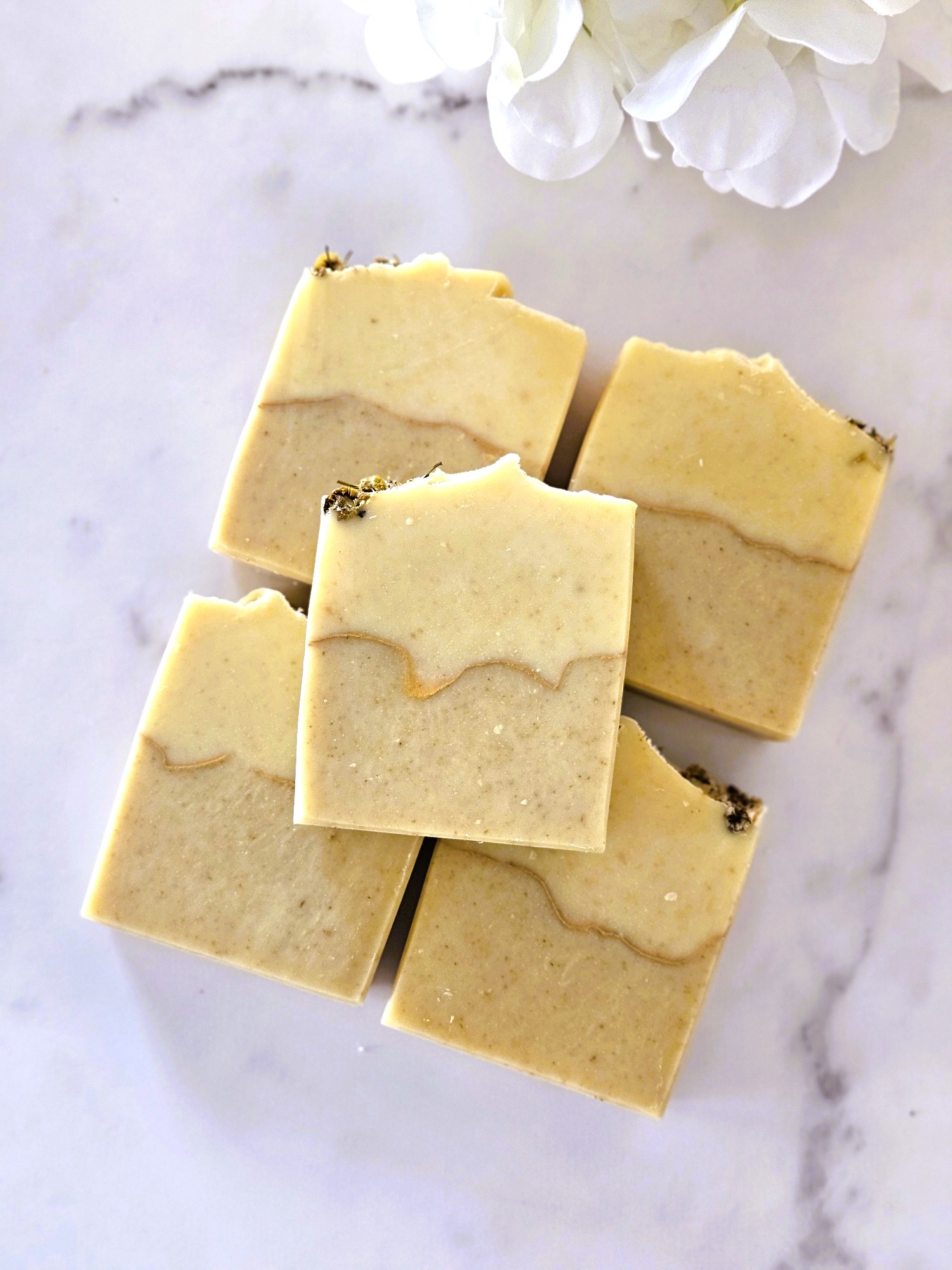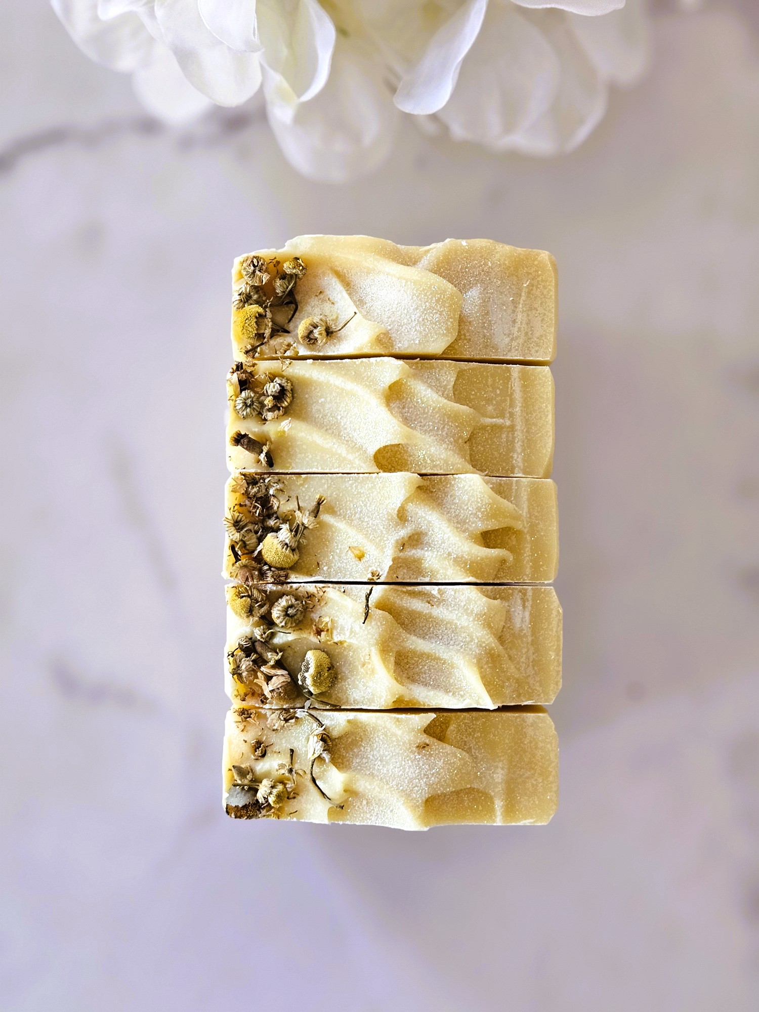 Natural additives include ground organic chamomile powder, raw turmeric powder, sea salt, Kaolin clay, aloe vera and mica for color. Fragranced with a delicious phthalate/paraben free premium fragrance oil with notes of gardenia, moonflower, jasmine and musk. Topped with a real organic chamomile flowers.